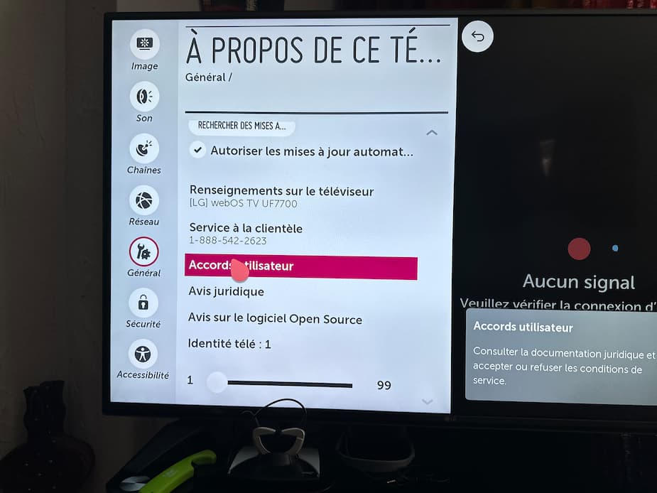Si vous avez l’un des téléviseurs susmentionnés, vous trouverez habituellement ces options dans les menus. Dans le cas de notre LG, c'est sous Général > À propos de ce téléviseur > Accords d’utilisateur. Selon la marque, les termes choisis dans les menus seront peut-être différents, mais similaires.