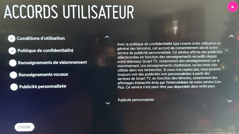 À gauche de ce menu LG, vous pouvez désactiver les options liées à la collecte de données et confirmer le tout en cliquant sur D’accord, en bas. (Après cette capture d'écran, j'ai également désactivé l'option Politique de confidentialité).