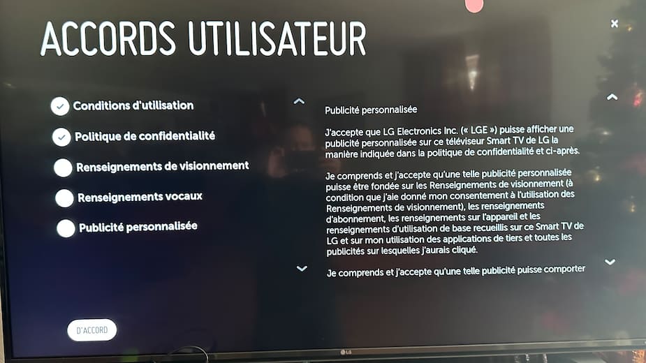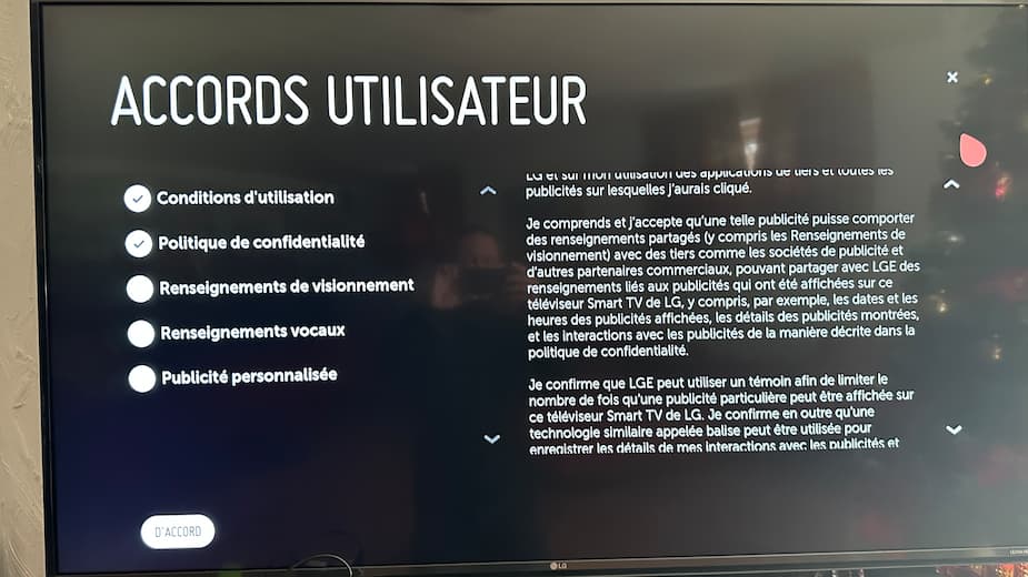 Dans le cas de ce téléviseur Smart TV de LG, les conditions et autres politiques sont affichées après le texte anglais qu’il faut faire défiler.